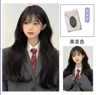 - Wig hairstyle: long curly hair, flat or slanted bangs
