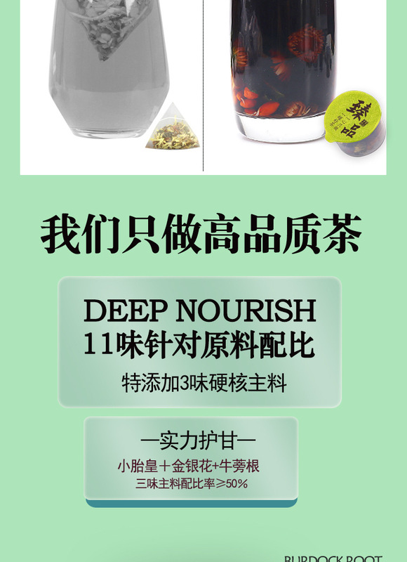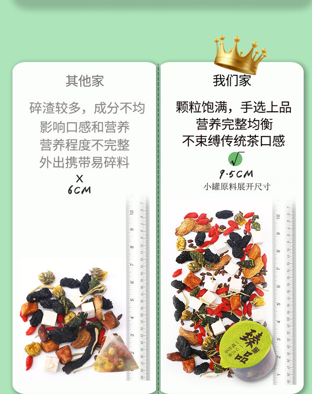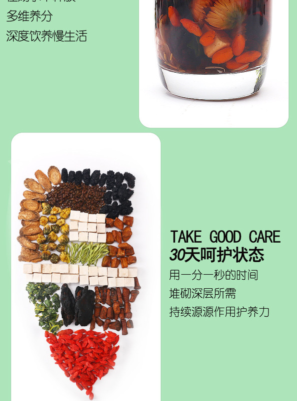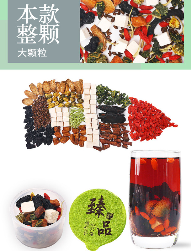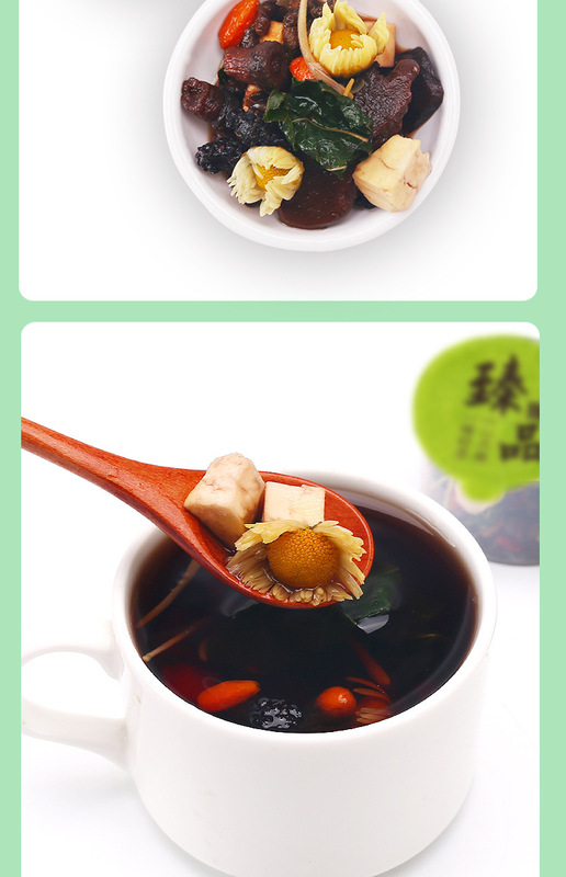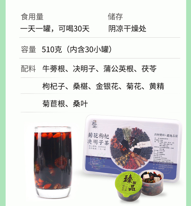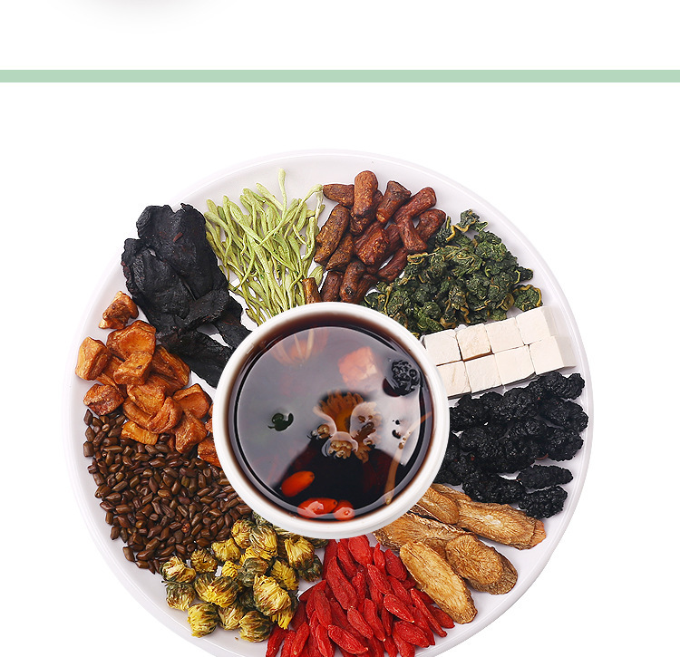 - Ingredients and Accessories: honeysuckle, chrysanthemum, goji berries, burdock root, dandelion root, cassia seed, poria, mulberry, polygonatum, chicory, mulberry leaf