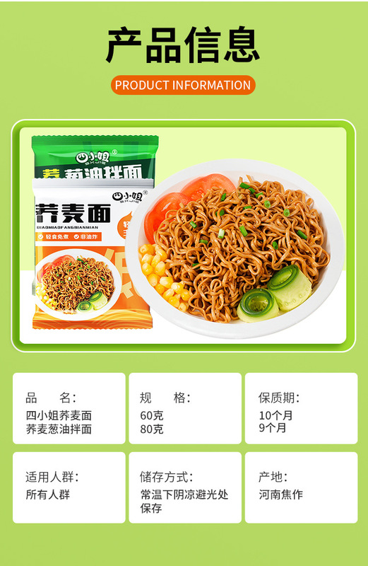 - Packaging specifications: 10 bags of buckwheat noodles with scallion oil (with ingredients package)
