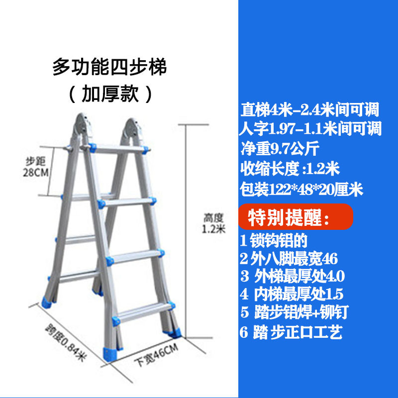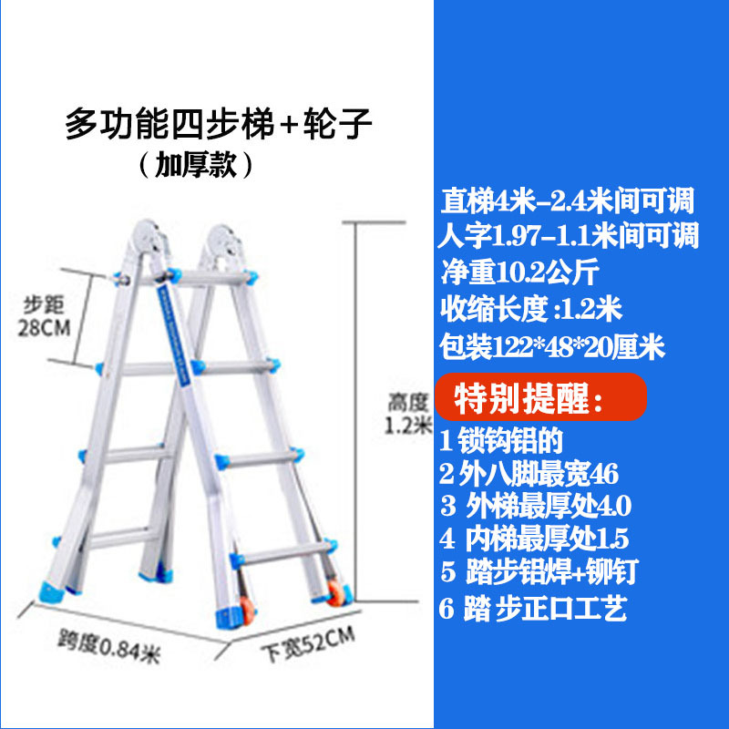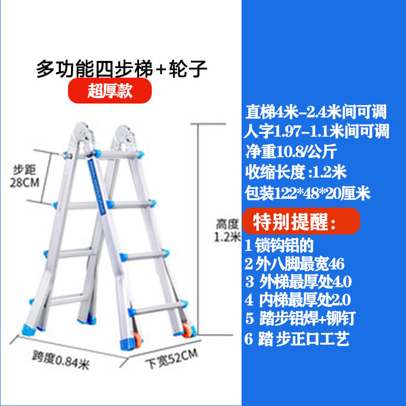 - Number of Steps: Thickened 4 steps = Straight Ladder 4.0 meters = A-Frame 1.9 meters + Wheels