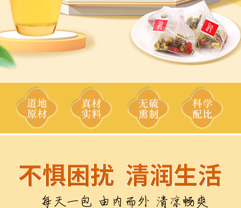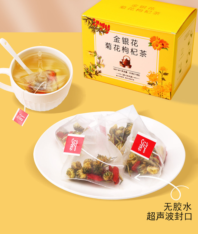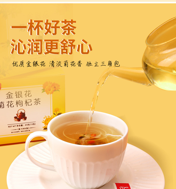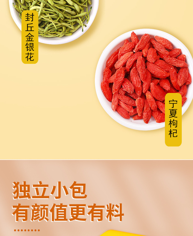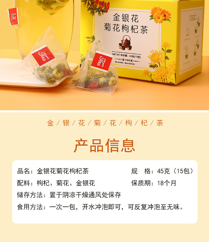 - 包裝規格:金銀花菊花枸杞茶45克黃盒獨立袋