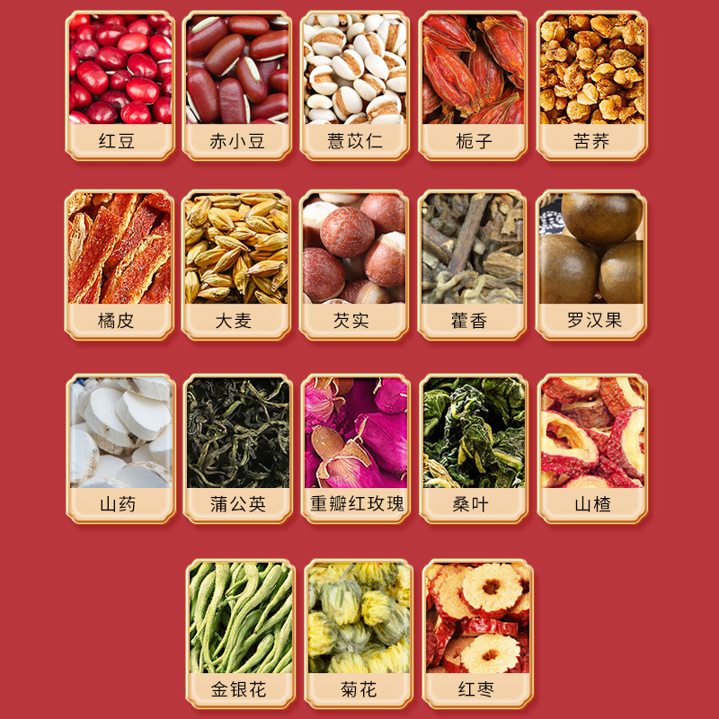 - Raw materials and ingredients: red beans, barley, gordon seeds, poria, gardenia, etc.