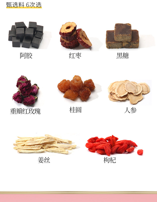 - Raw materials and ingredients: ginseng, donkey hide gelatin, longan, brown sugar, shredded ginger and rose
