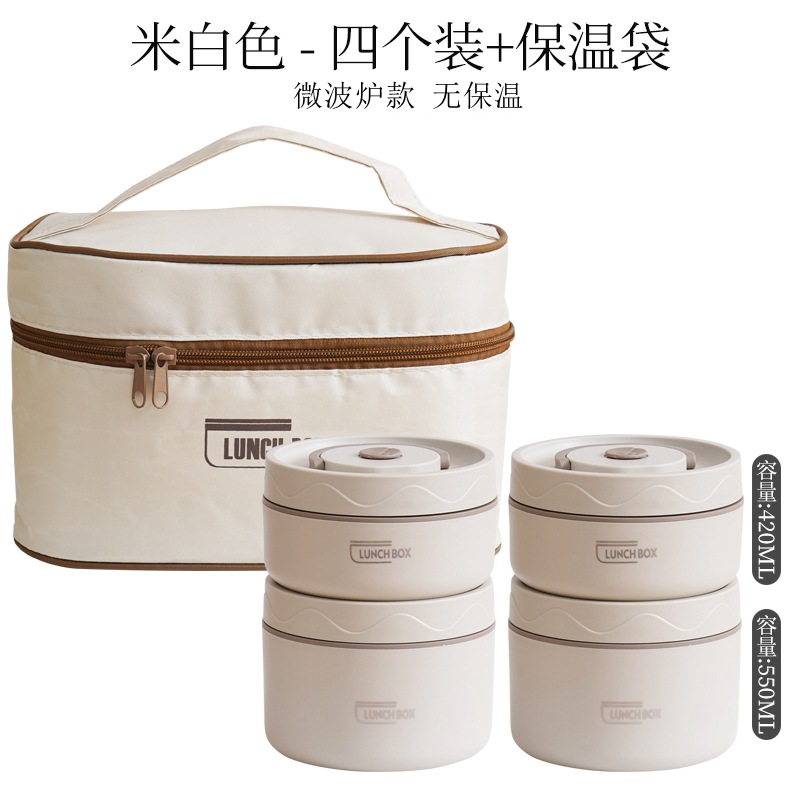 - Specifications: Microwave-safe white 304 round lunchbox 4-pack + insulation bag