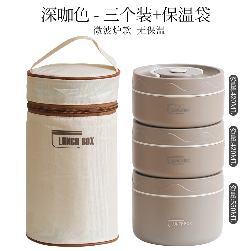 - Specifications: Microwave-safe brown 304 round lunchbox 3-pack + insulation bag