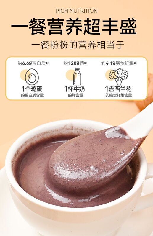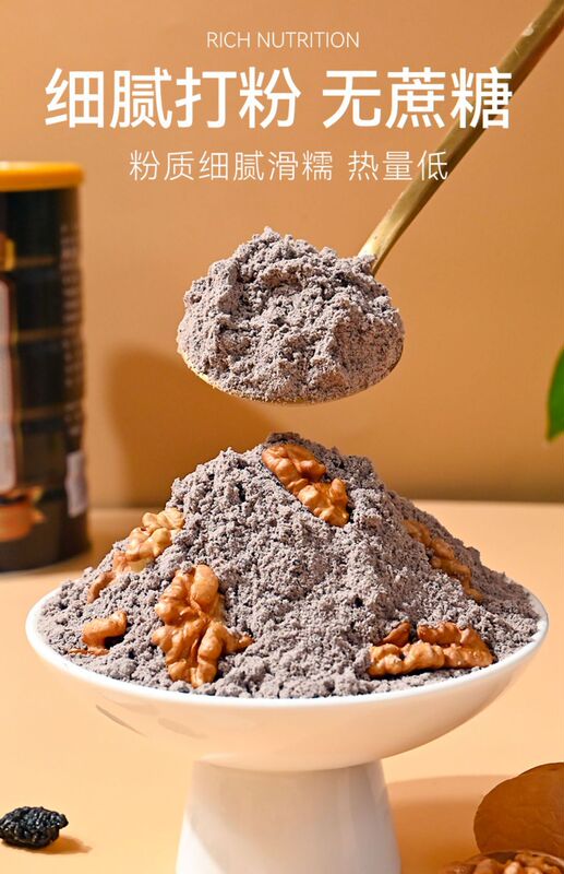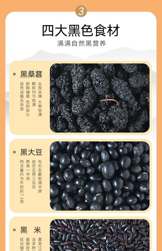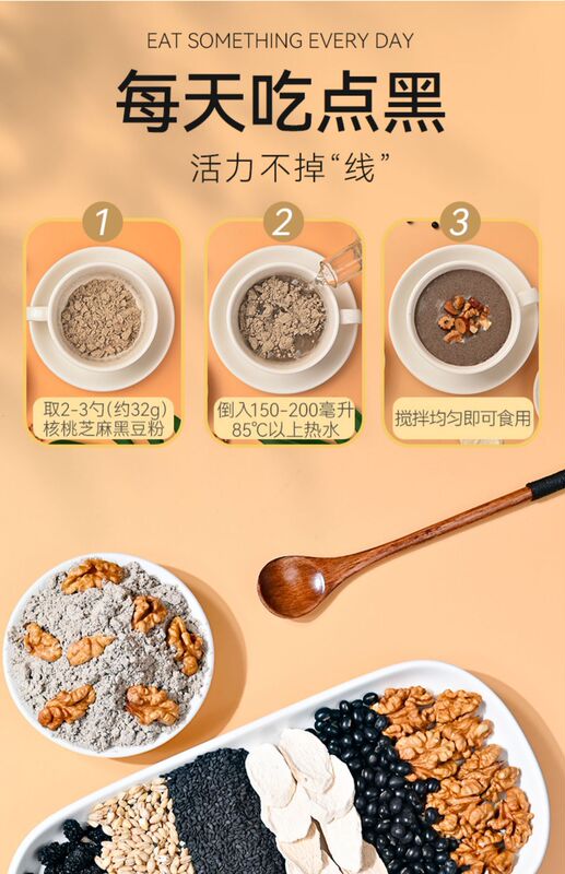 - Main nutrients: black beans, edible glucose, oats, rock sugar, black rice, black sesame, quinoa, mulberry, walnut kernels