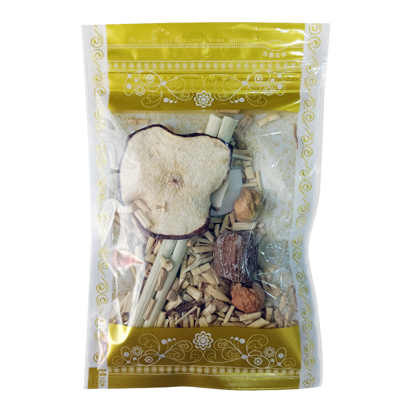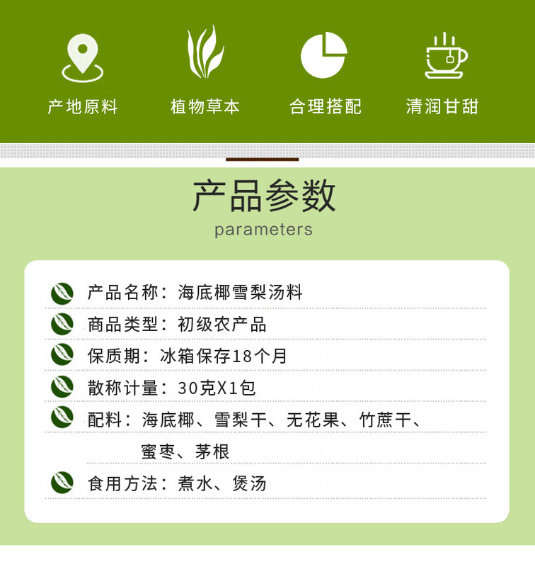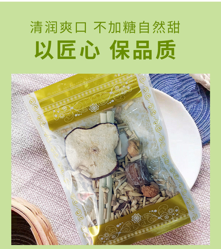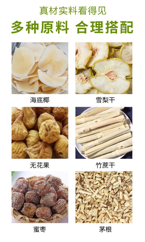 - Raw materials and ingredients: sea coconut, dried snow pear, grass root, candied dates, grass root