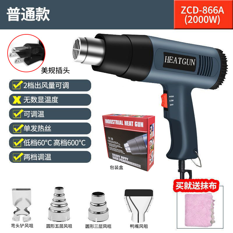 - Model: Two-speed temperature-adjustable hot air gun 866A comes standard with packaging (medium size) + three-layer air nozzle + five-layer air nozzle + duckbill air nozzle + elbow air nozzle + towel