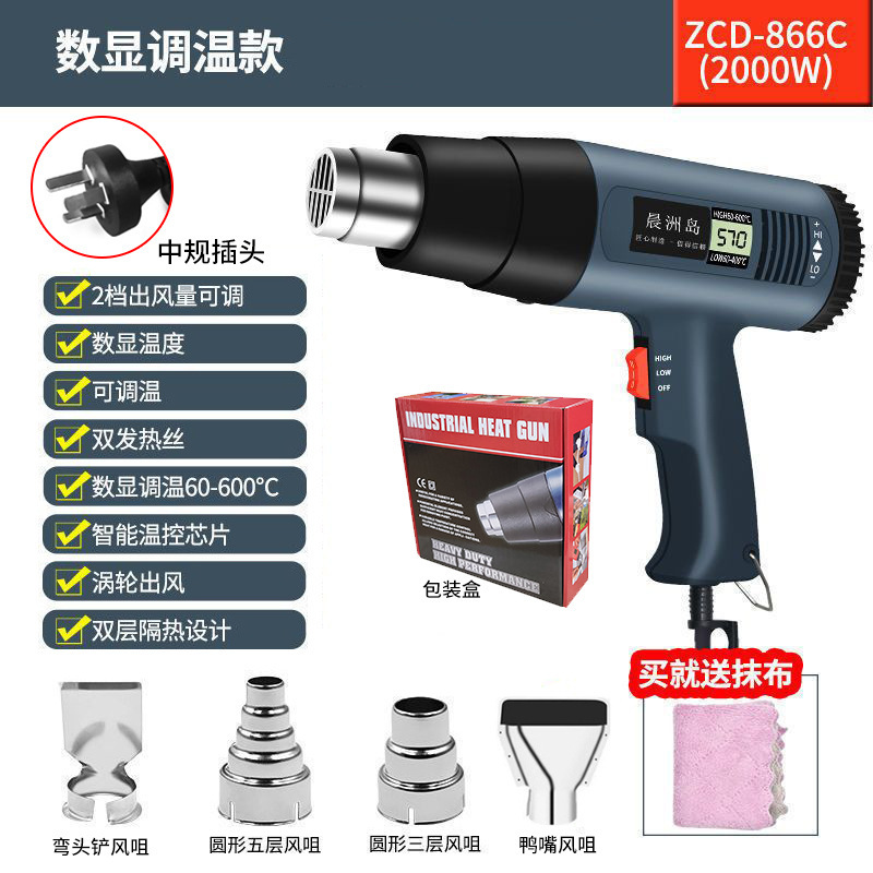 - Model: Digital display hot air gun 866C comes standard with packaging (European regulations) + three-layer air nozzle + five-layer air nozzle + duckbill air nozzle + elbow air nozzle + towel