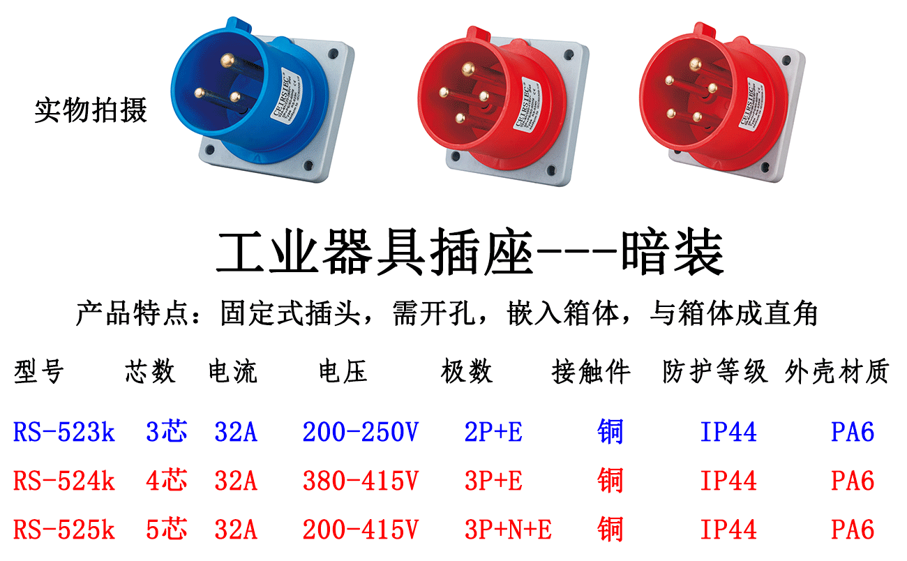 - Specifications and models: 5-core 32A concealed reverse plug RS-525K