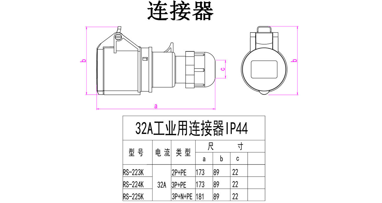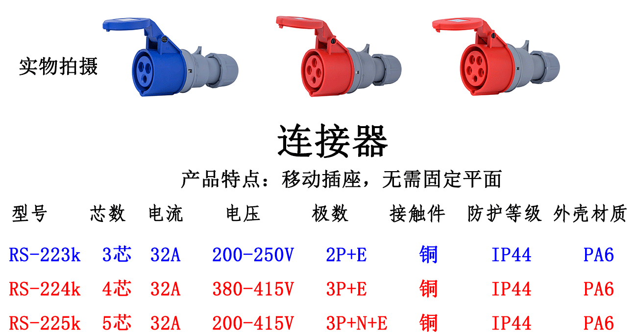 - Specification model: 3-pin 32A connector RS-223K