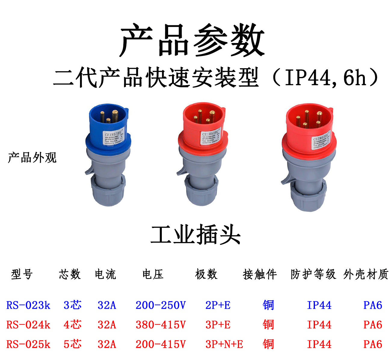 - Specification model: 3-core 32A plug RS-023K