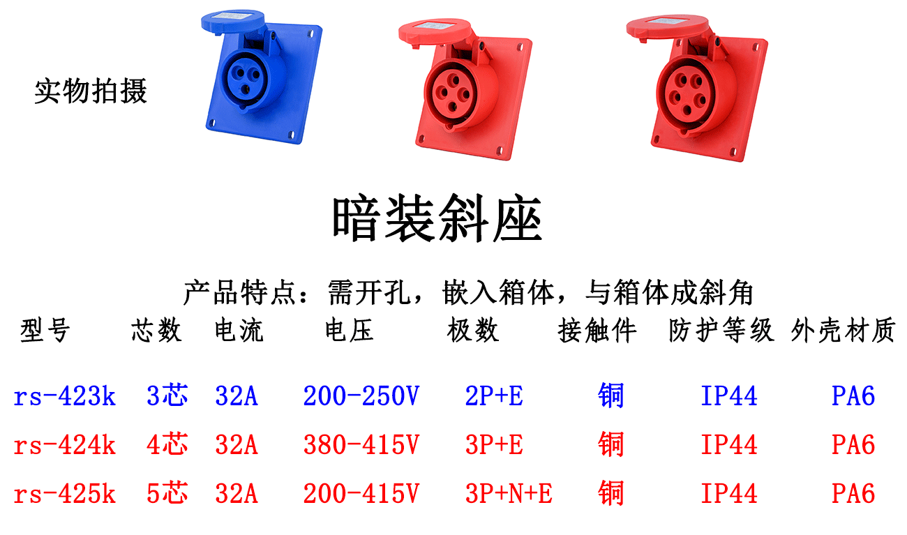 - Specifications and models: 3-core 32A concealed inclined seat RS-423K