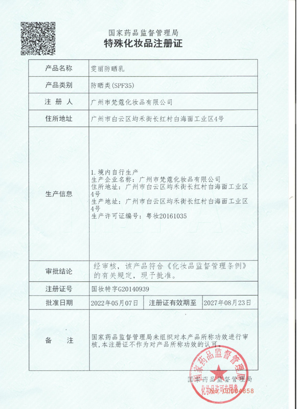 - Special purpose cosmetics certificate number: National cosmetics special character G20140939