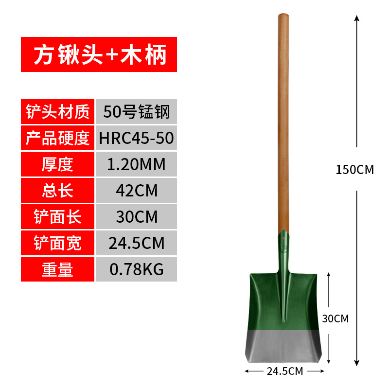 - Specifications: [All steel blade] Thickened and hardened shovel (square head + 1.2m wooden handle)
