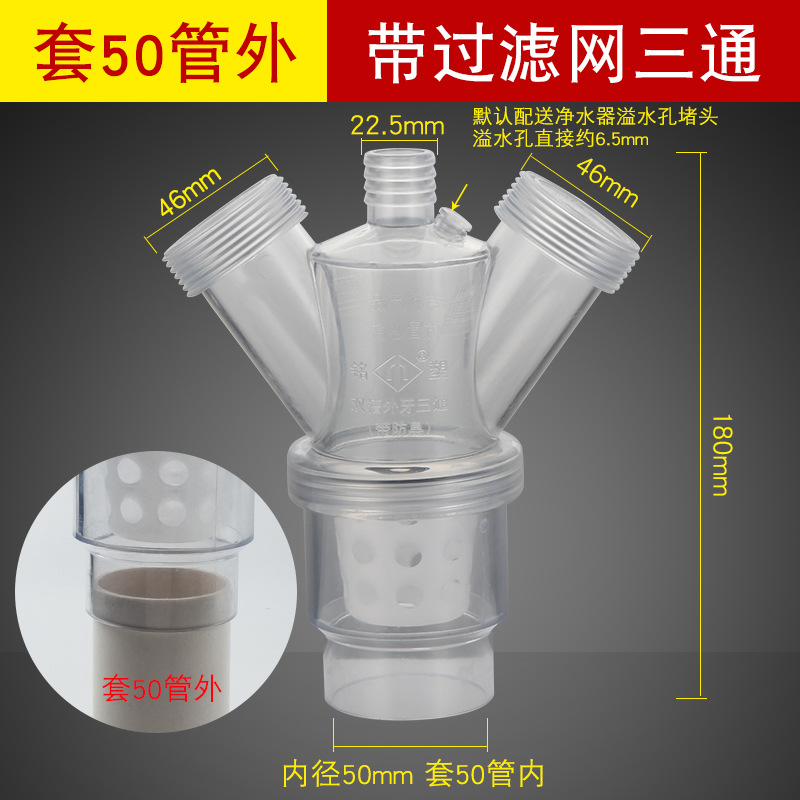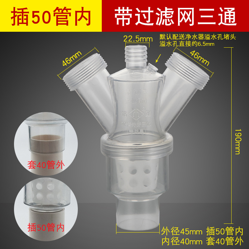 - Specifications: [Y-shaped tee] anti-overflow with filter [inserted in 50 pipe]