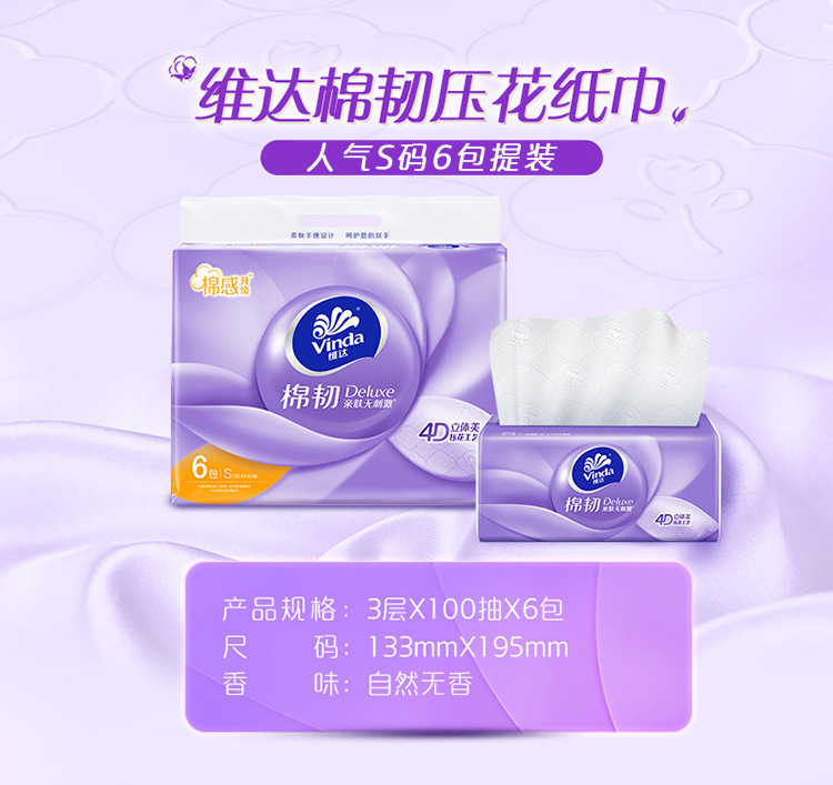 - 產品規格:V2833-6【棉韌提裝S碼100抽】S碼x100抽x3層x6包/提195mm*133mm