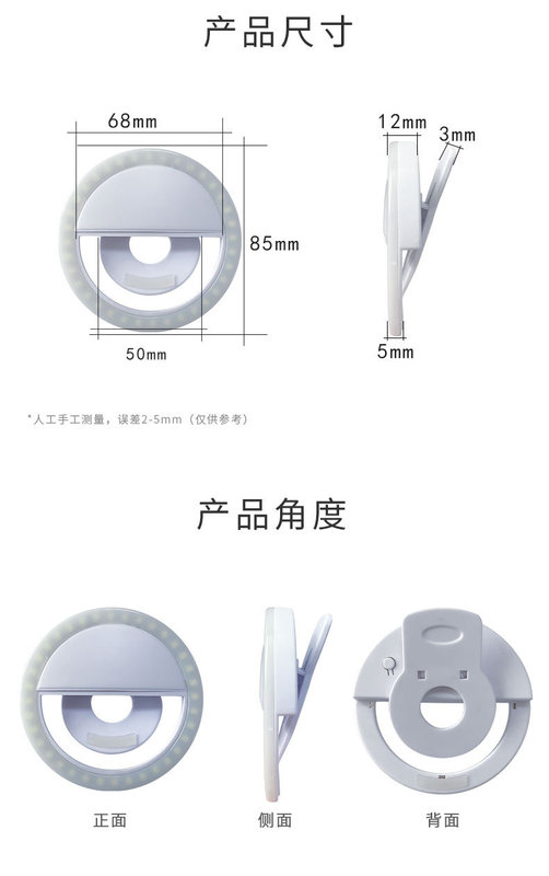 - Packing list: usb charging cable, color box, fill light