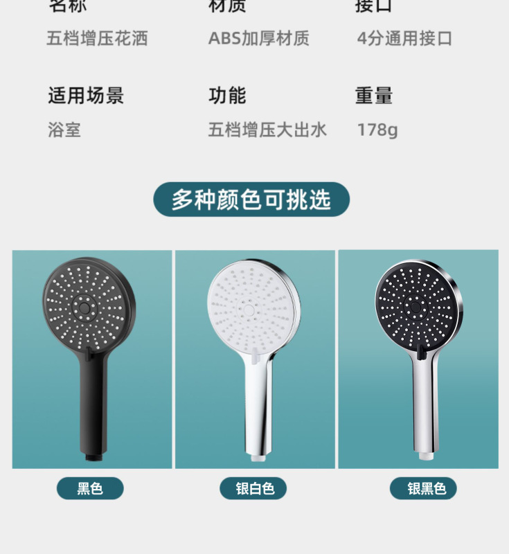 - Specifications: Five-speed silver-black shower head + neutral white packaging box
