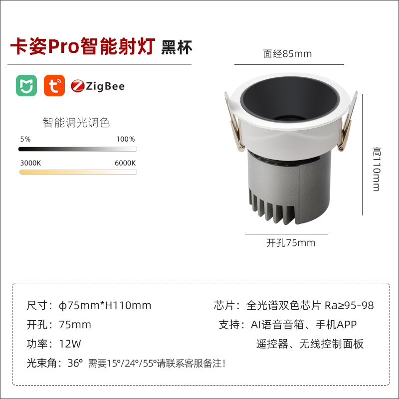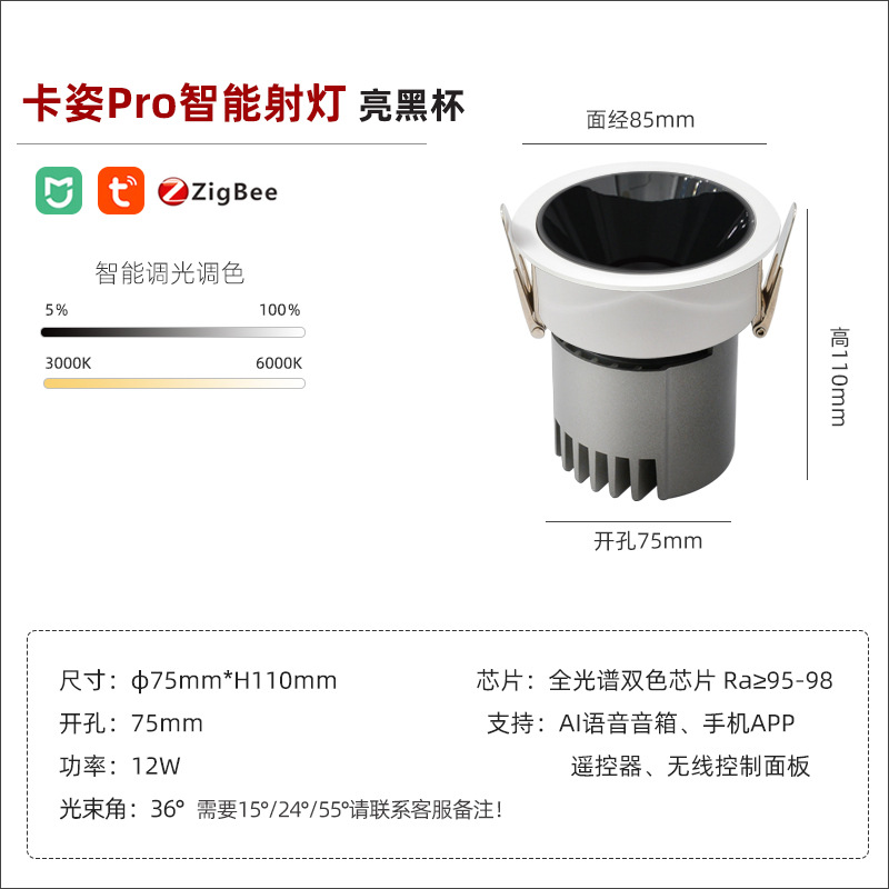 - Power: smart spotlight/bright black cup/12W/opening 75