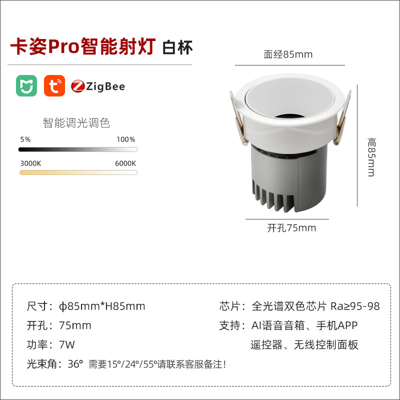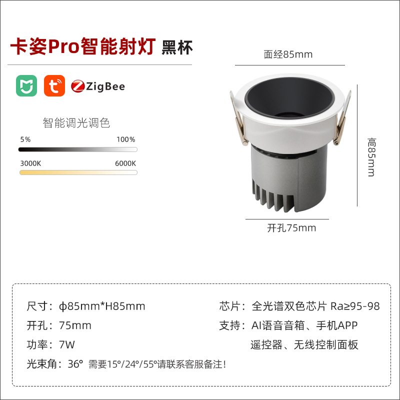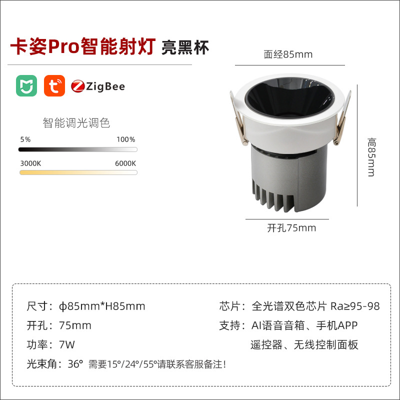 - Power: smart spotlight/bright black cup/7W/opening 75