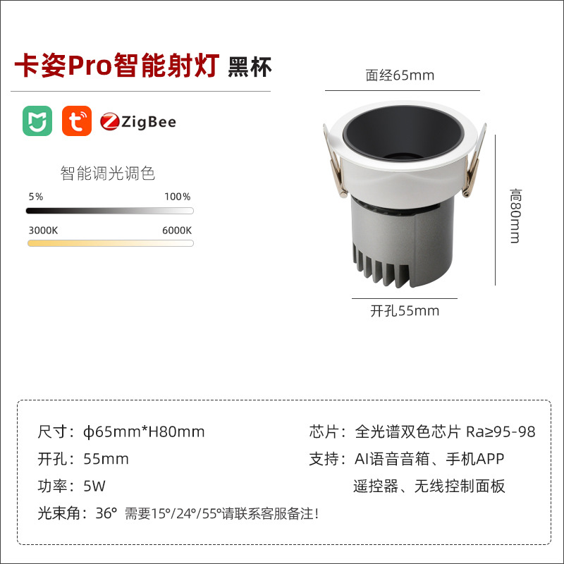 - Power: smart spotlight/bright black cup/5W/opening 55