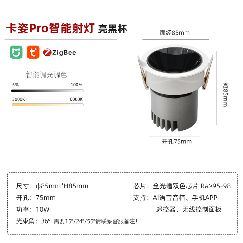 - Power: smart spotlight/bright black cup/10W/opening 75