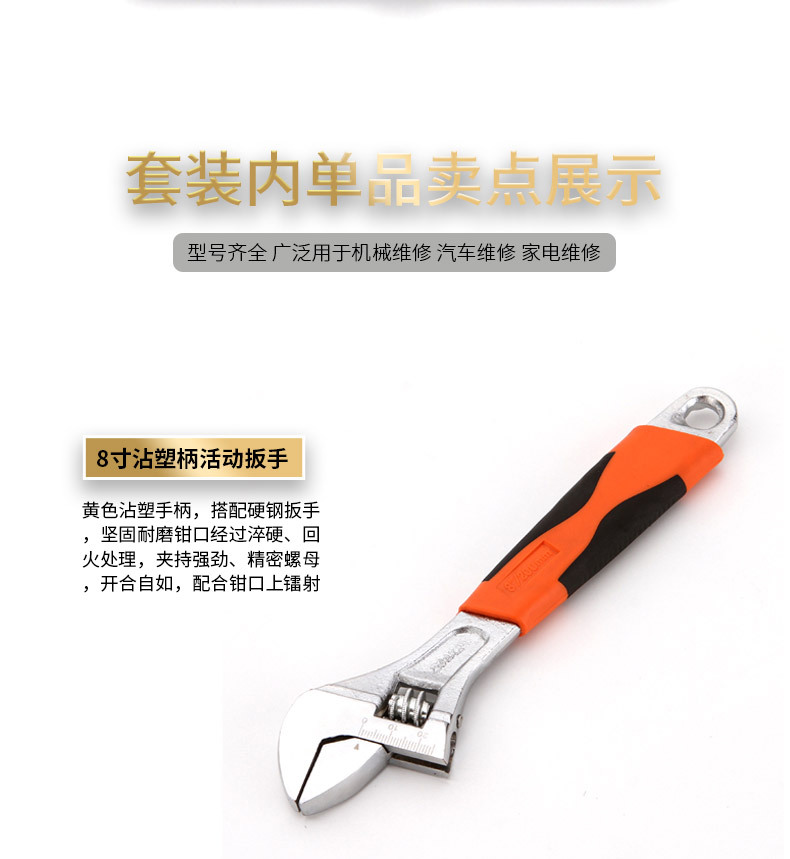 - Specifications and models: Rubber-coated adjustable wrench (8-inch carbon steel)