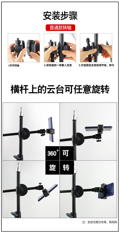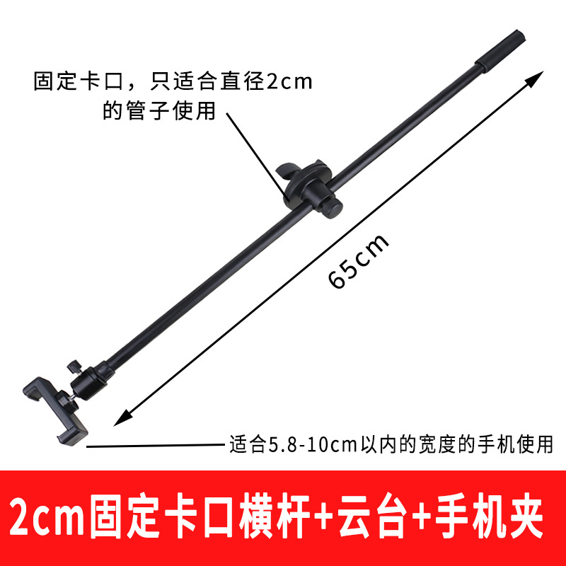 - Product specifications: 2cm fixed shaft crossbar + pan/tilt + mobile phone clip