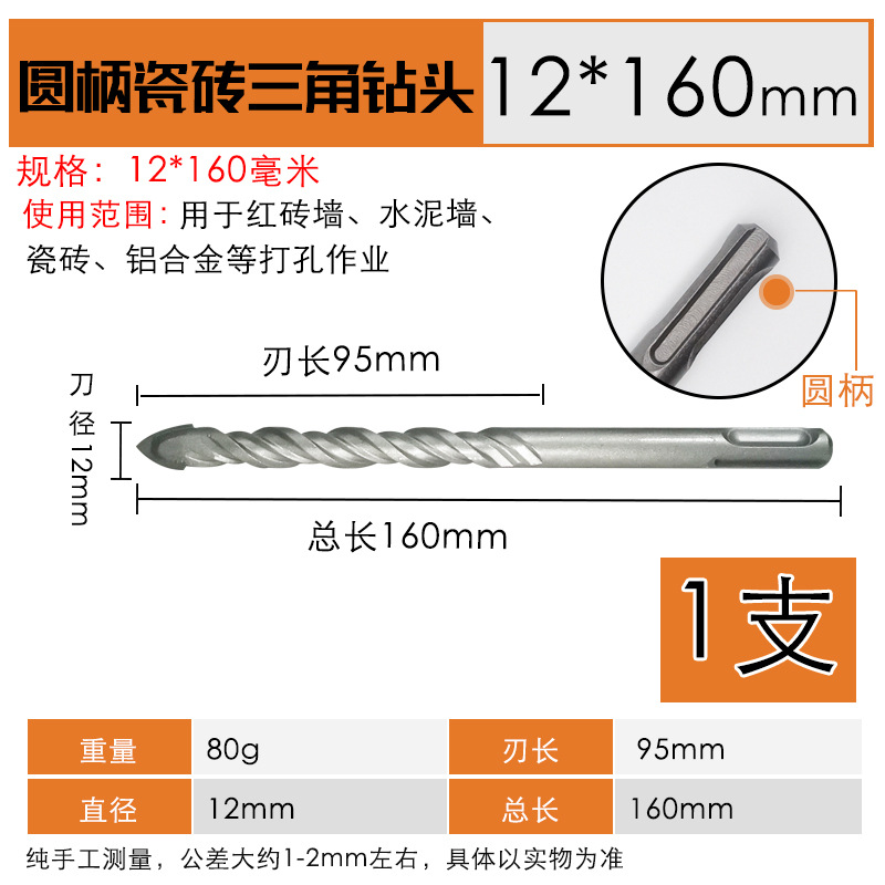 - Model Specification: Round Handle Hammer Drill One-Point Tile Triangle Drill Bit 12*160mm