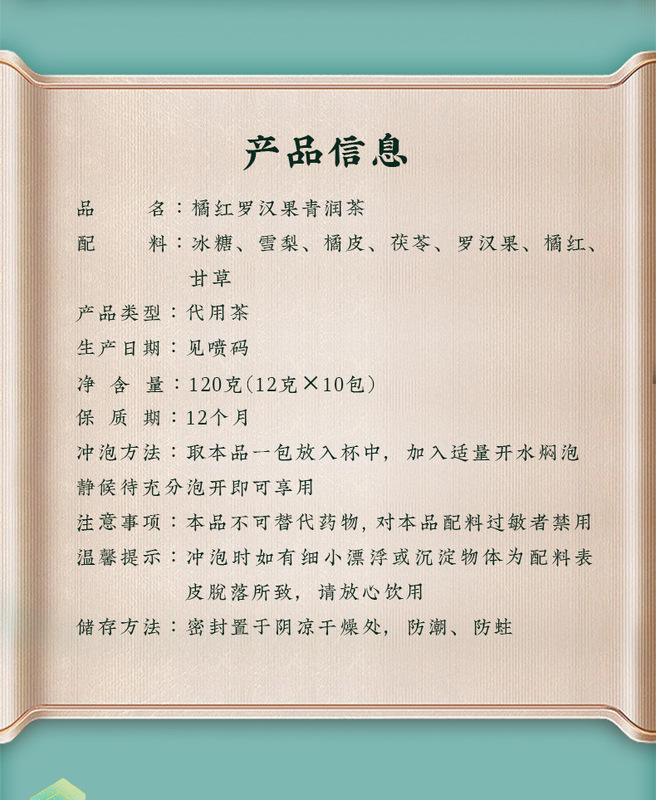 - Ingredients and Compositions: Rock Sugar, Snow Pear, Tangerine Peel, Poria, Monk Fruit, Tangerine Peel, Licorice