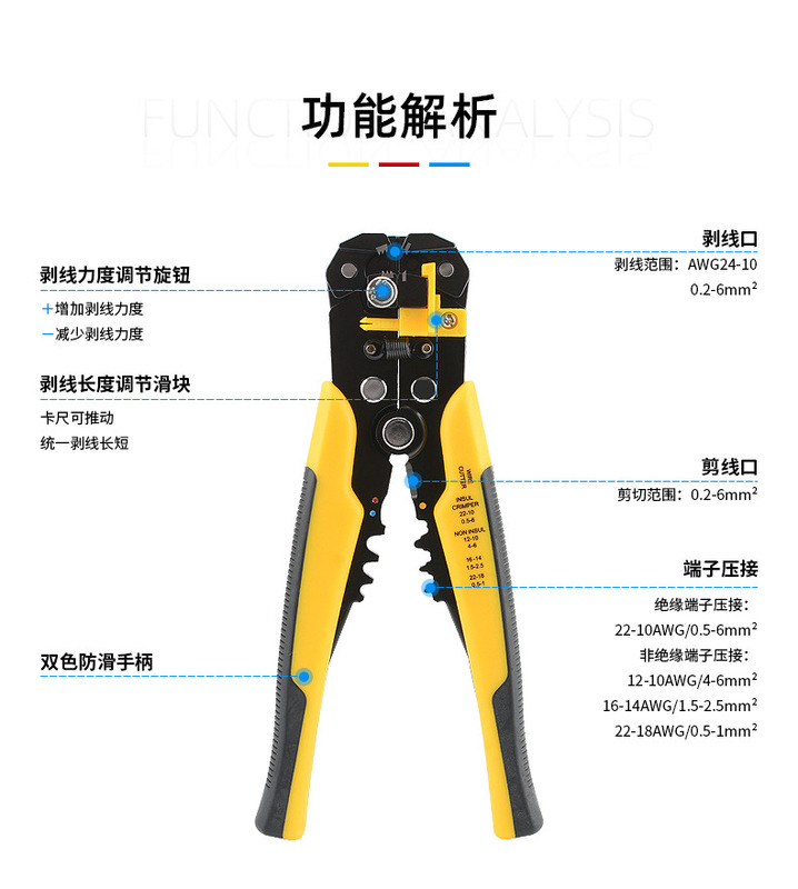 - Stripping range: 24-10AWG/0.2-6mm