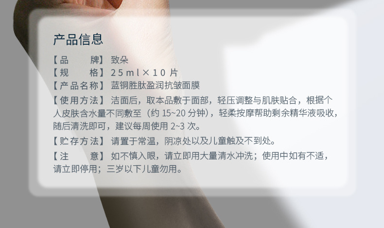 - 產品規格:致朵藍銅胜肽盈潤抗皺面膜-(盒裝)25mlx10片
