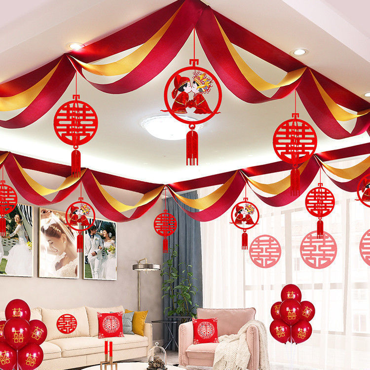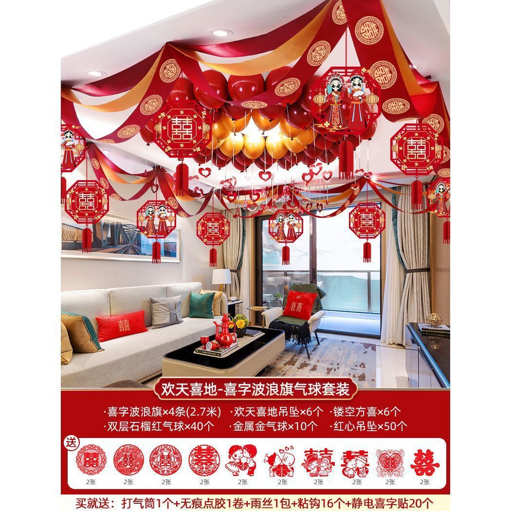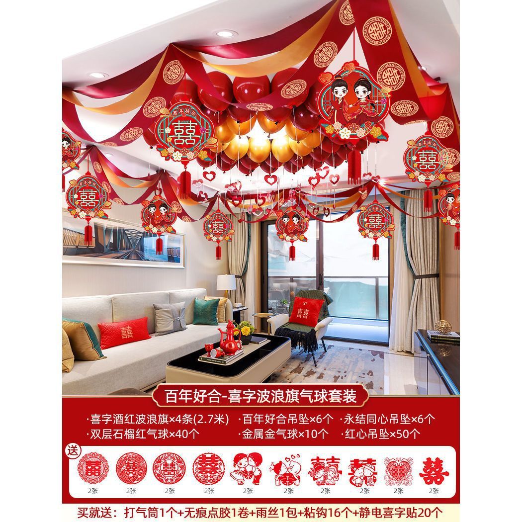 - Specifications: 4 burgundy round happy wavy flags + Qianqian hollow happy pendants (16 sticky hooks included)