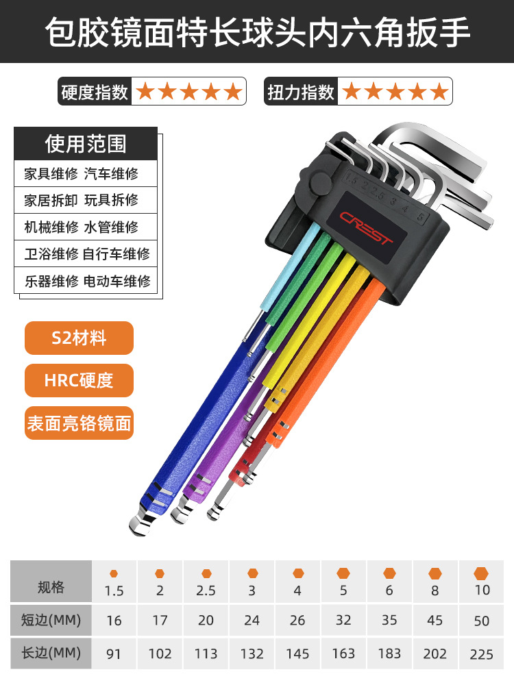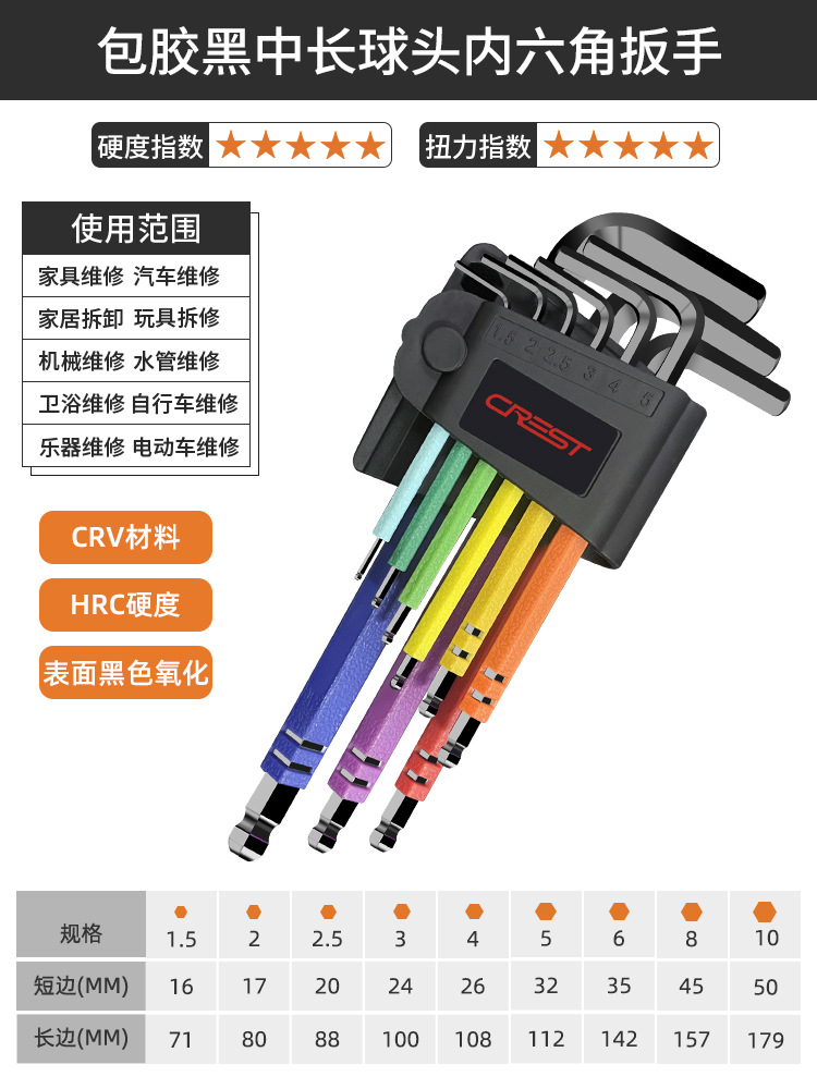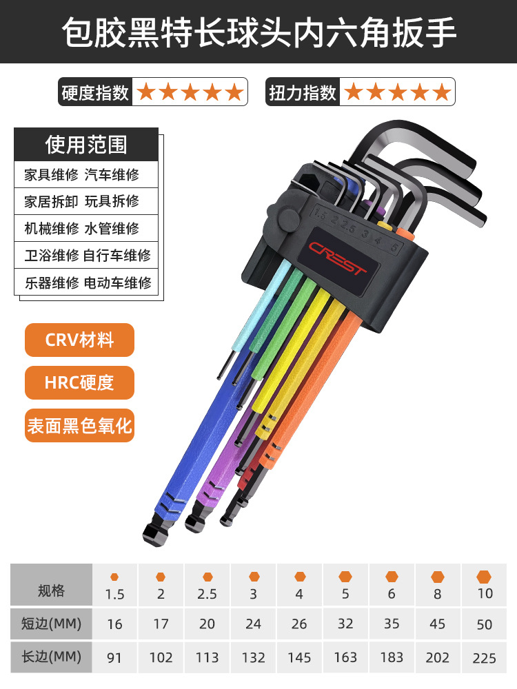 - 規格型號:9件套彩色CRV中長球頭內六角扳手