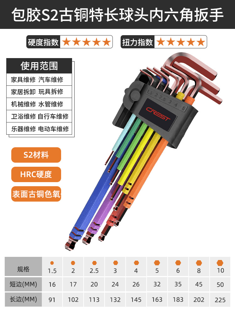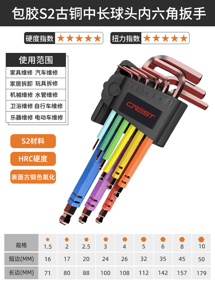 - 規格型號:9件套彩色S2古銅中長球頭內六角扳手