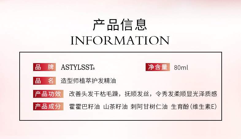 - Product name: Stylist Leave-in Hair Care Essential Oil