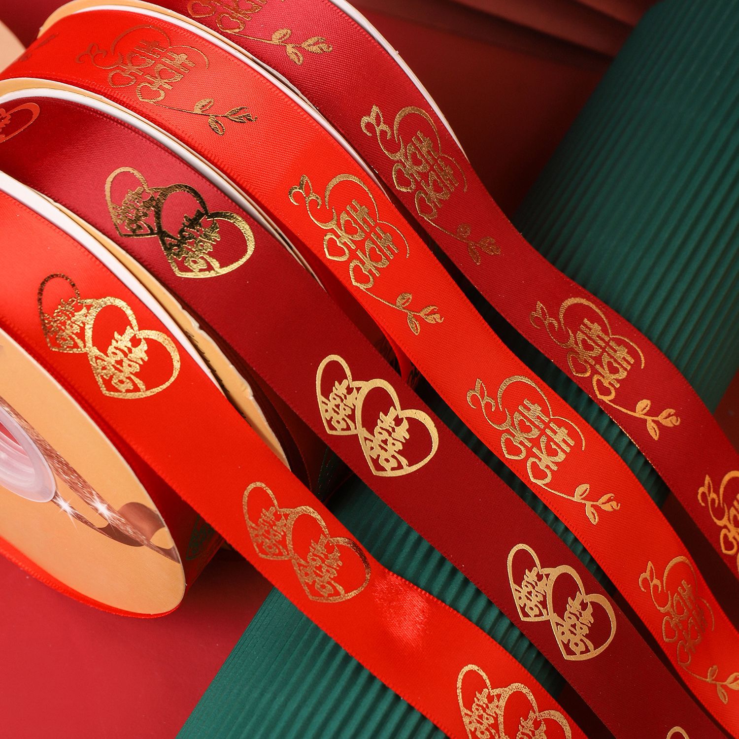 - 規格型號:燙金滌綸帶2.5cm酒紅色2號雙心歡-喜50碼/卷