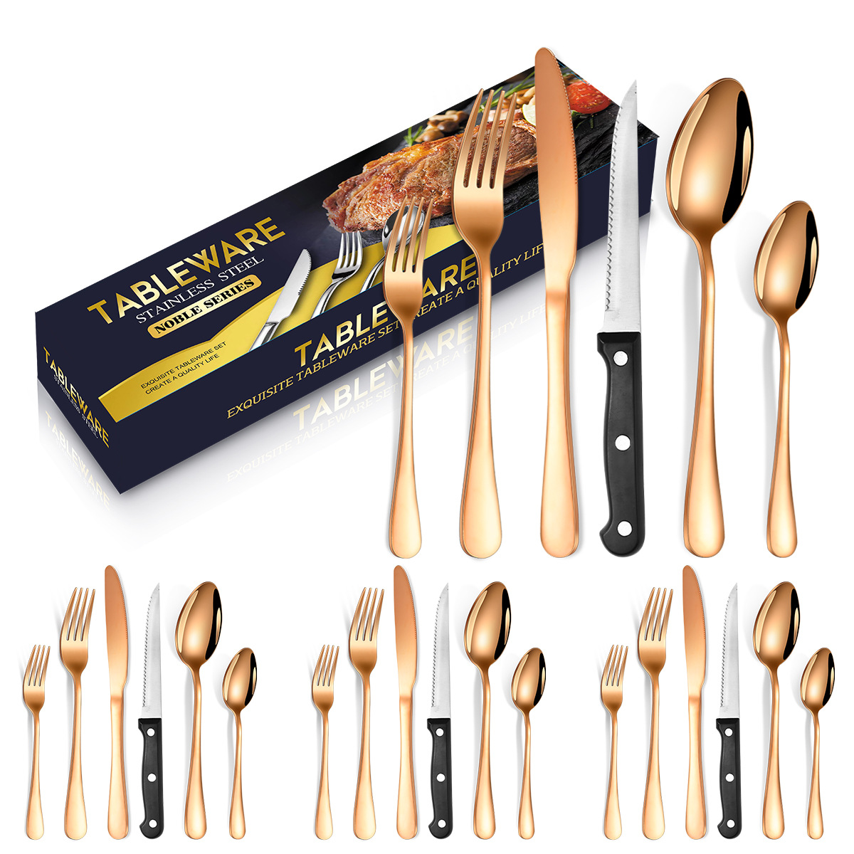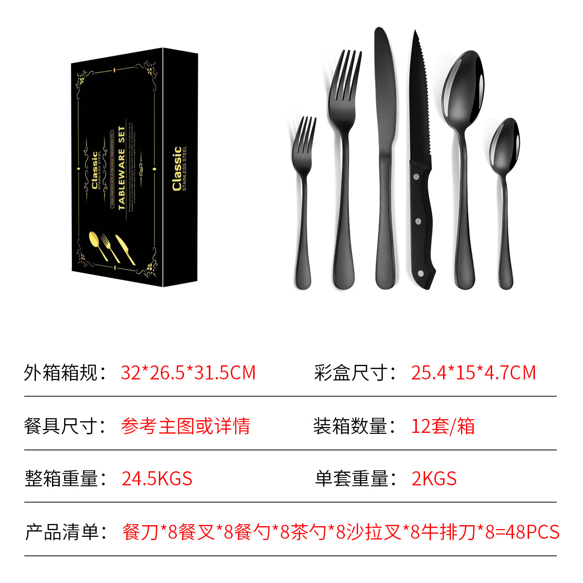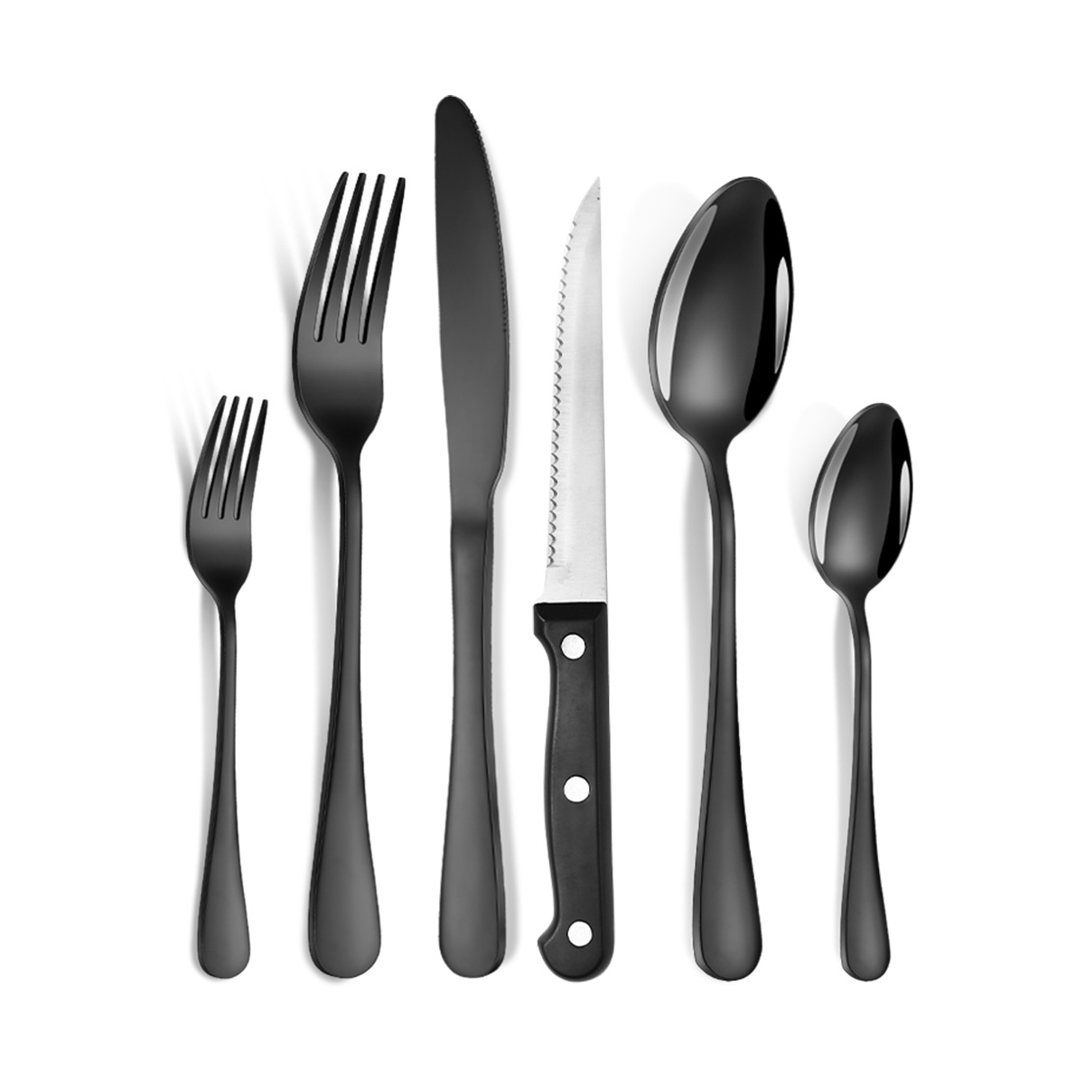 - 套裝清單:牛排刀,餐刀,餐勺,餐叉,甜品勺,甜品叉