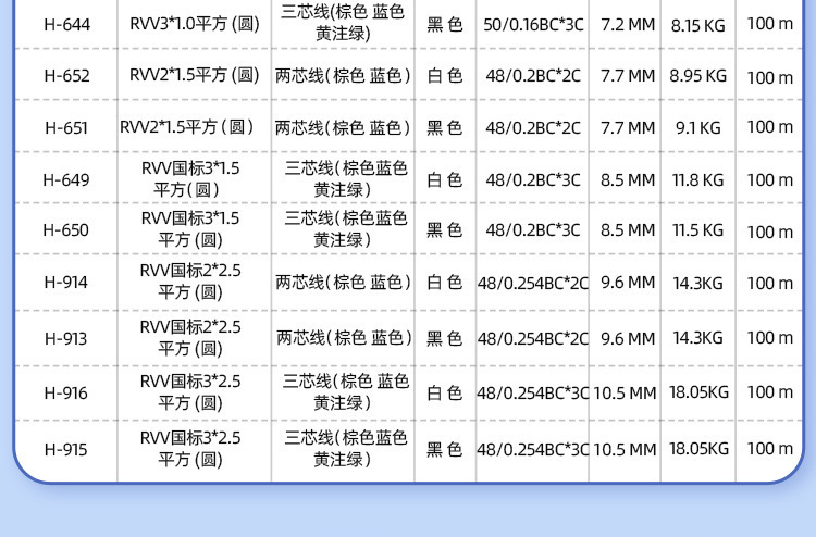 - Specification Model: White RVV2*2.5 Square (Round) Two-Core Wire