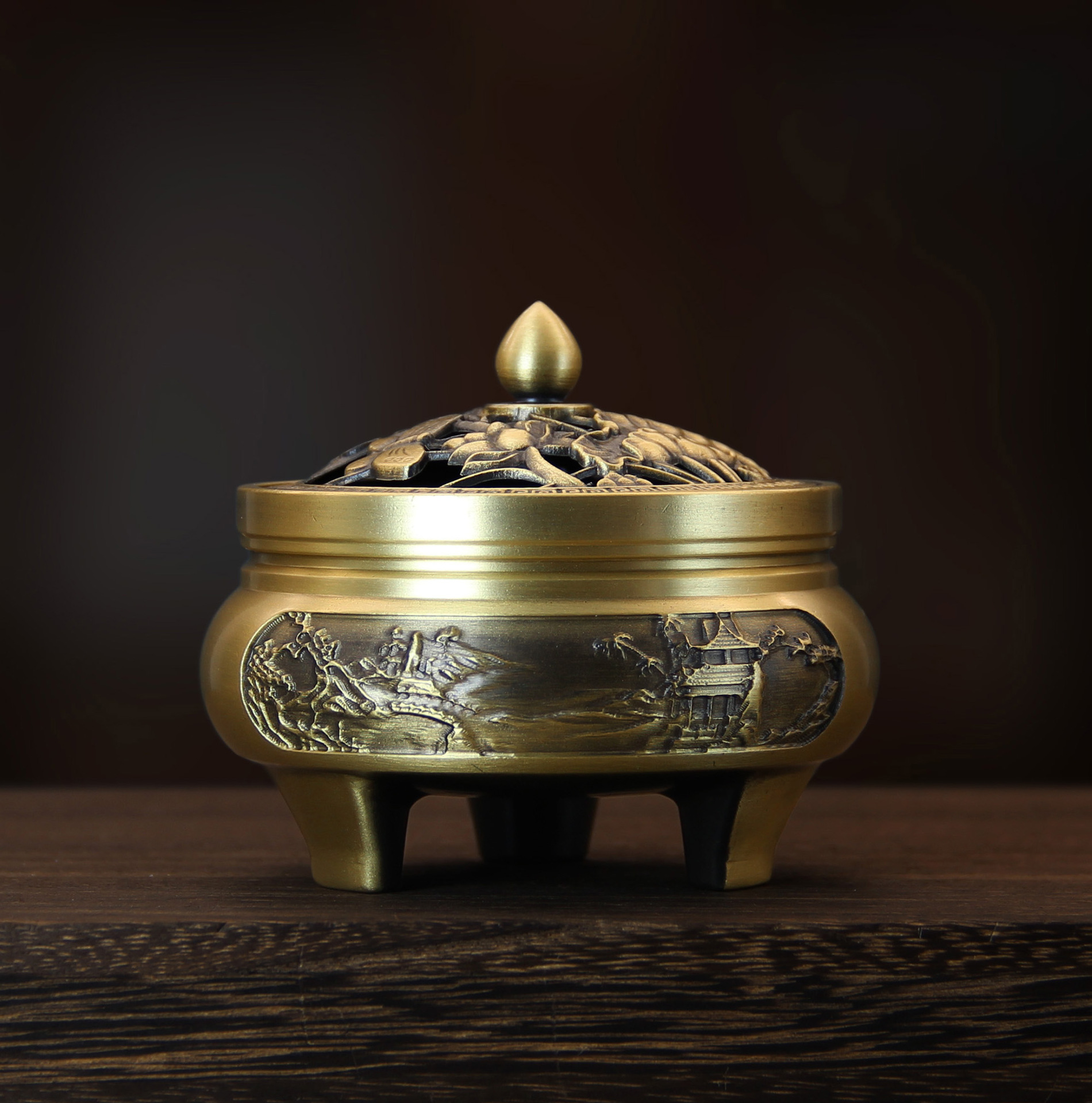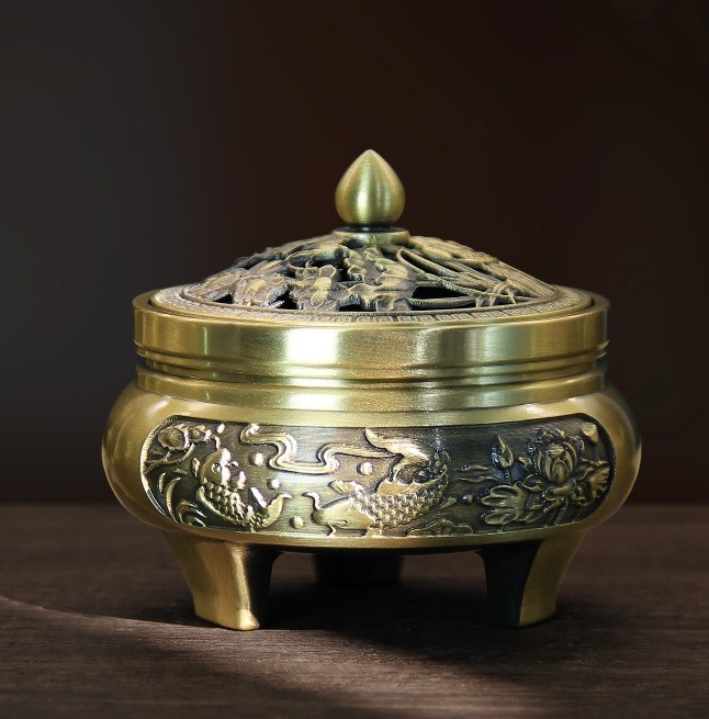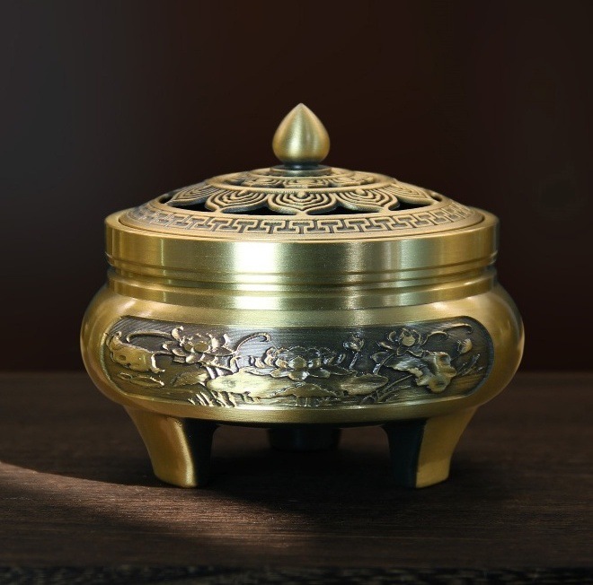 - Specifications: Golden lotus carved three-legged stove (small size)