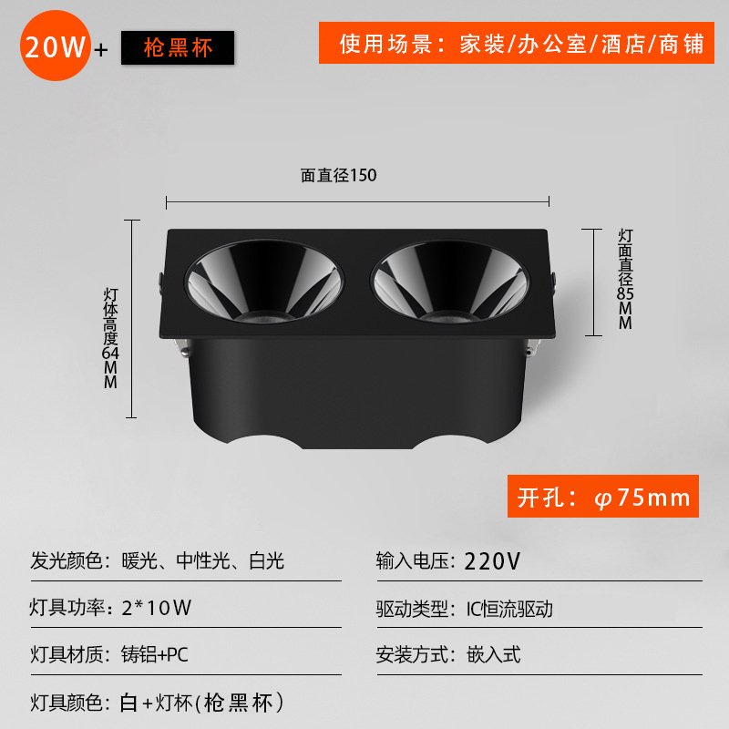 - 功率:方形150*75開孔20W黑色款
