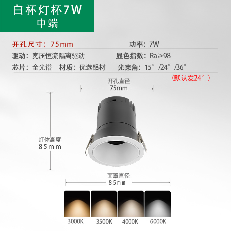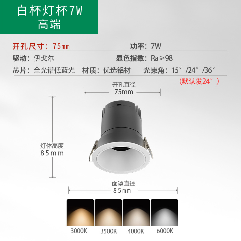 - Power: Eye Protection Low Blue Light White Cup 75 Open Hole 7W CRI 98 5-Year Warranty