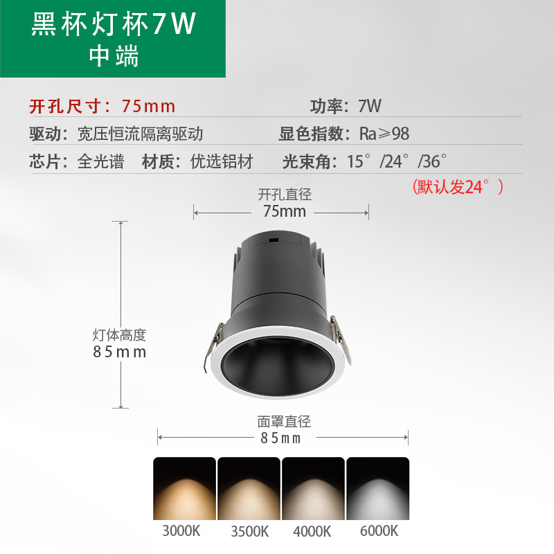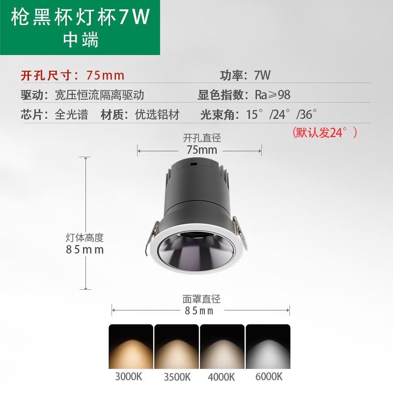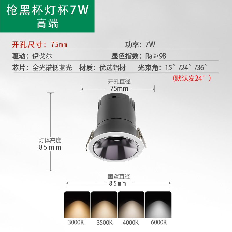 - Power: Eye Protection Low Blue Light Gun Black Cup 75 Open Hole 7W CRI 98 5-Year Warranty