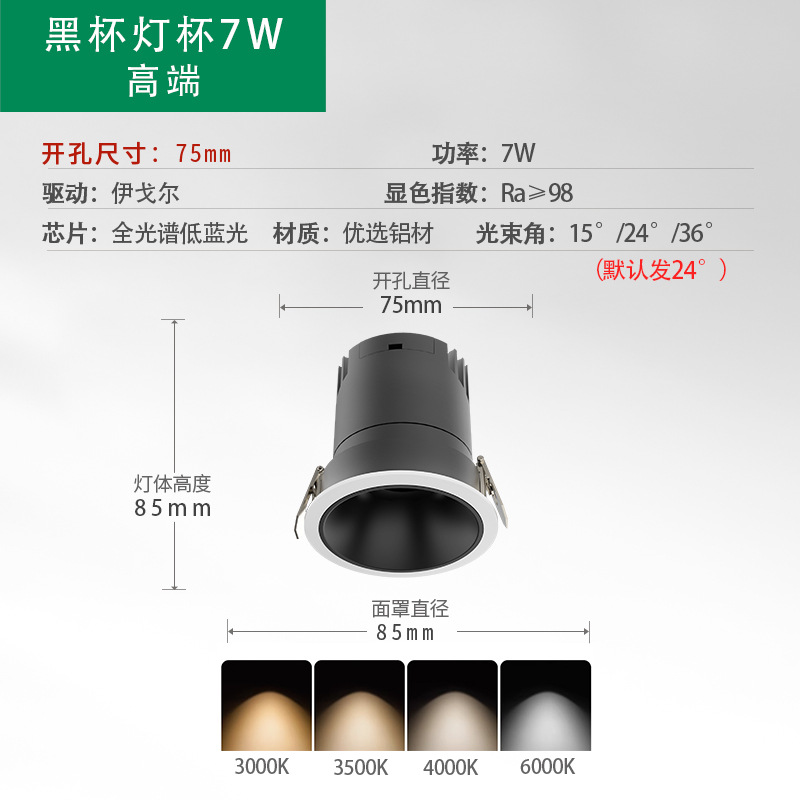 - Power: Eye Protection Low Blue Light Black Cup 75 Open Hole 7W CRI 98 5-Year Warranty