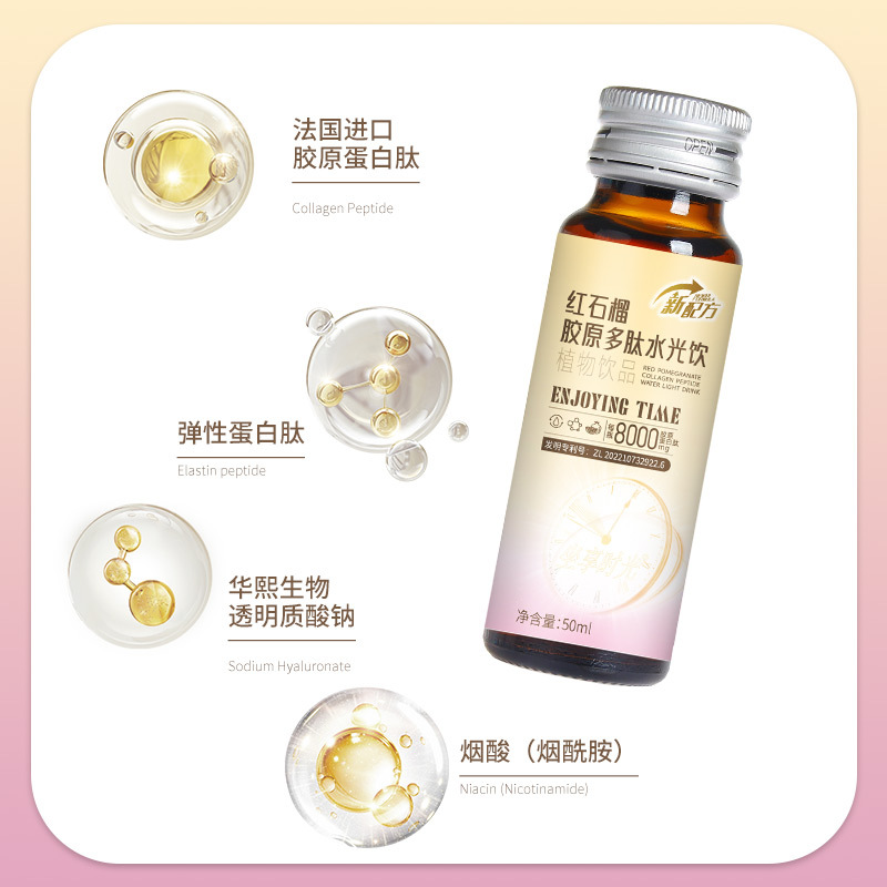 - 原料與配料:魚膠蛋白肽紅石榴煙酰胺透明質酸鈉
