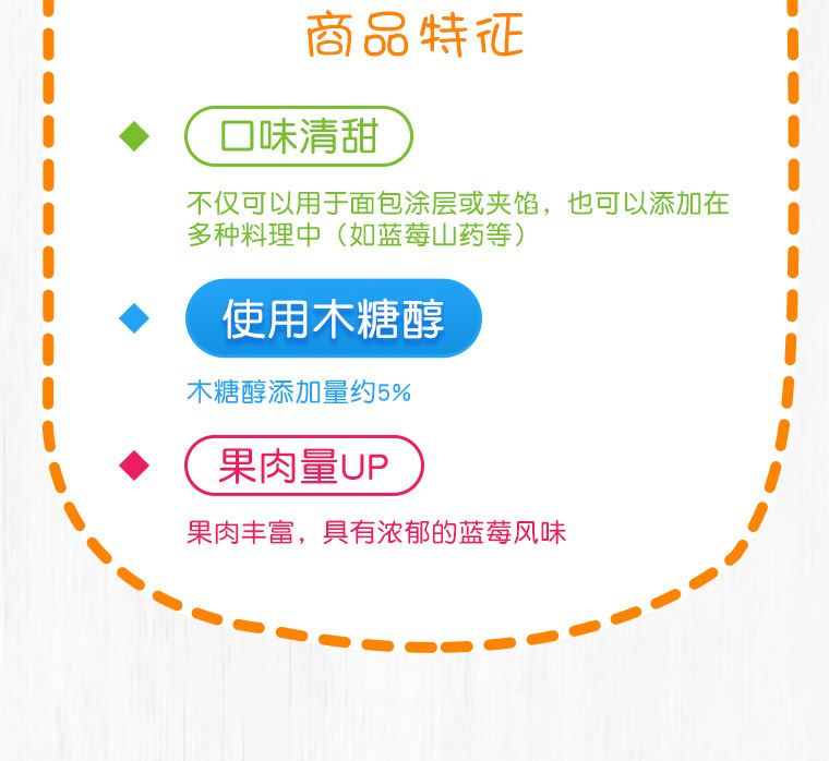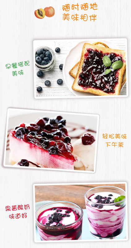 - Raw materials and ingredients: white sugar, blueberries, maltose syrup, water, food additives (xylitol, pectin), etc. Please see the packaging for details