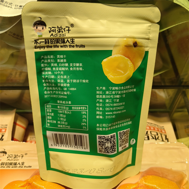 - 原料與配料:黃桃,白砂糖,精鹽