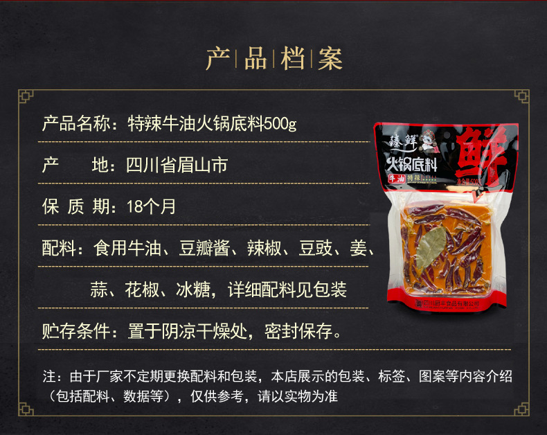 - Packaging Specification: 500g Clarified Oil Spicy Hot Pot Base