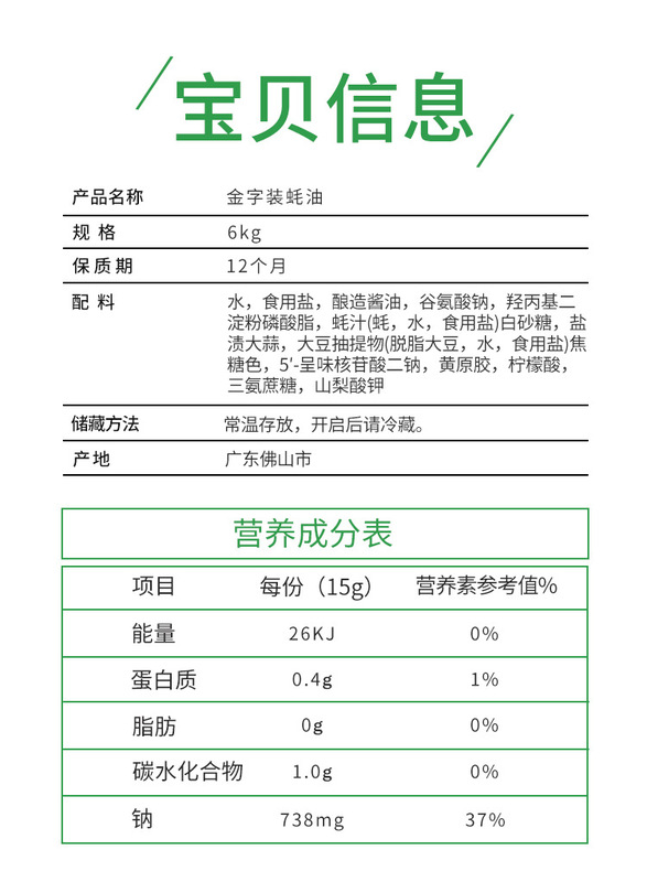 - Raw materials and ingredients: water, oyster juice, white sugar, edible salt, sodium glutamate, hydroxypropyl distarch phosphate, caramel color, wheat flour, 5-flavored nucleotide disodium, xanthan gum,